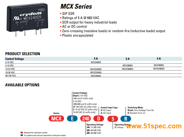 | MCXE480D5 | 15-32 VDC | 5 A | 48-660 VAC | PCB |