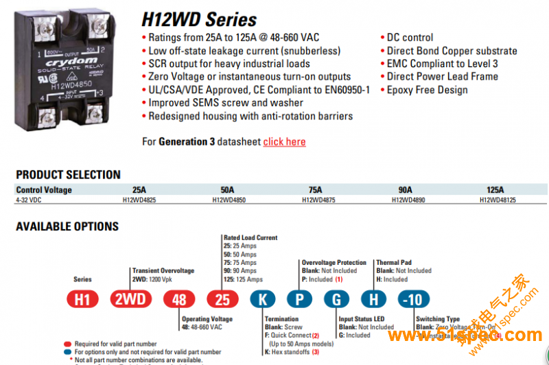 | H12WD48125-10 | 4-32 VDC | 125 A | 48-660 VAC | Panel |