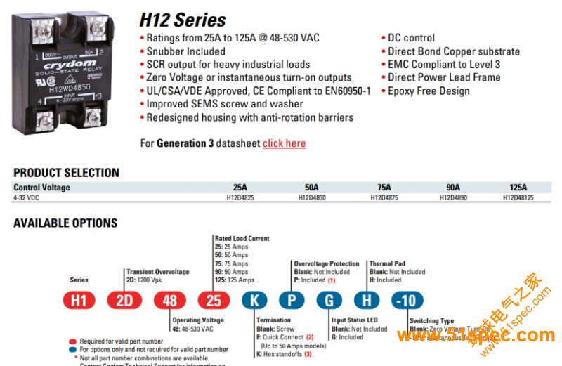 | H12D48125-10 | 4-32 VDC | 125 A | 48-530 VAC | Panel |